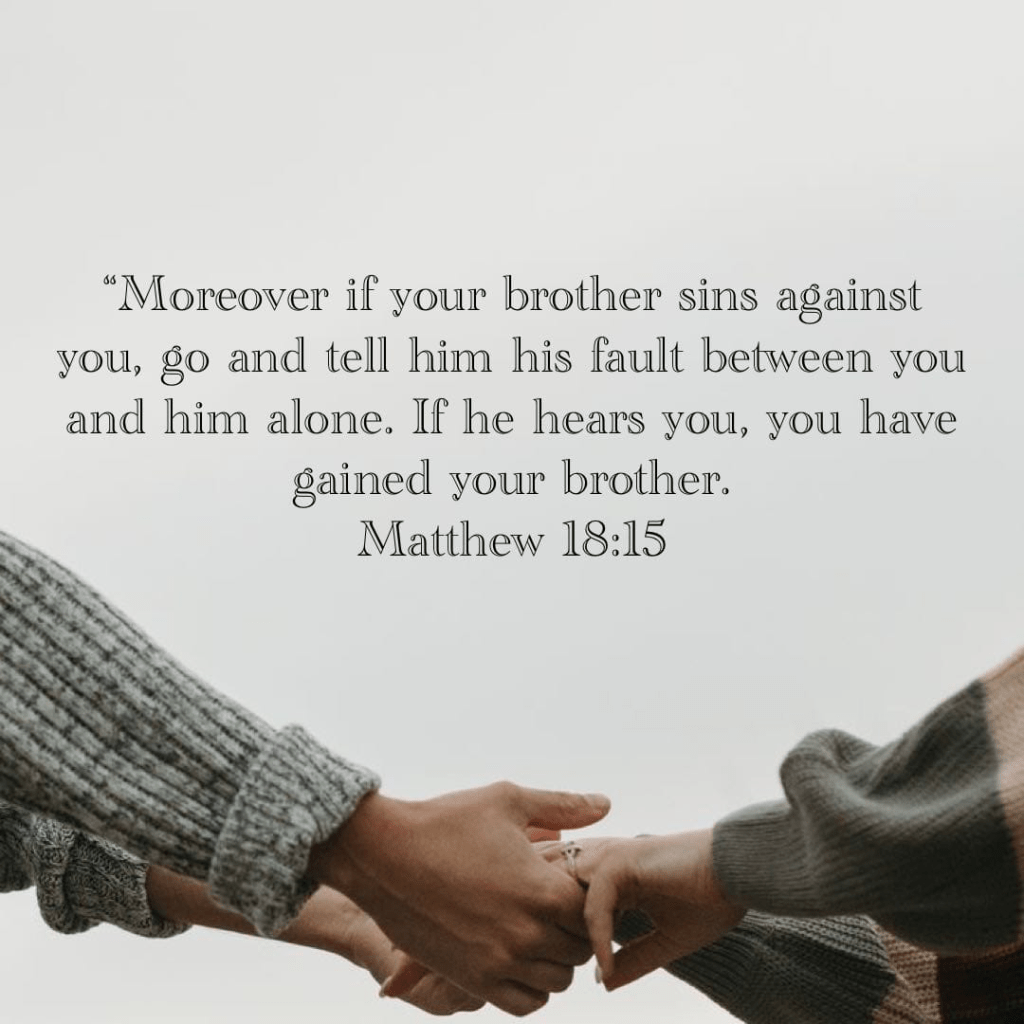 15 “If your brother sins against you, go and tell him his fault, between you and him alone. If he listens to you, you have gained your brother. 16 But if he does not listen, take one or two others along with you, that every charge may be established by the evidence of two or three witnesses. 17 If he refuses to listen to them, tell it to the church. And if he refuses to listen even to the church, let him be to you as a Gentile and a tax collector. 18 Truly, I say to you, whatever you bind on earth shall be bound in heaven, and whatever you loose on earth shall be loosed in heaven. 19 Again I say to you, if two of you agree on earth about anything they ask, it will be done for them by my Father in heaven. 20 For where two or three are gathered in my name, there am I among them.” (Matthew 18:15–20 (ESV)