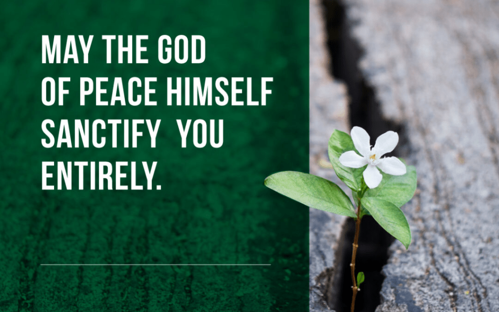 The apostle began his prayer by saying, “Now may the God of peace himself sanctify you completely.” Paul called God the God of peace. This is a recurring title for the Lord ((cf. Rom. 15:33; 16:20; 2 Cor. 13:11; Phil. 4:9; 2 Thess. 3:16; Heb. 13:20). Peace (εἰρήνης) refers to tranquility and freedom from worry. Within the context, the term refers to the harmony between God and believers in Christ. This peace is based upon Jesus Christ’s substitutionary atonement on the cross and his redeeming and reconciling work by grace alone through faith alone (Romans 5:1-10).